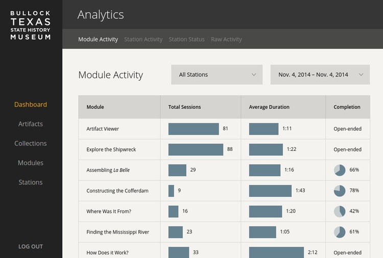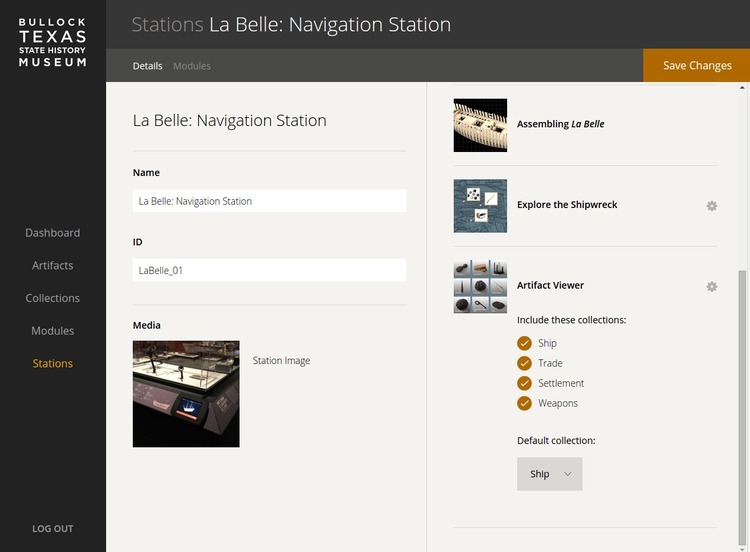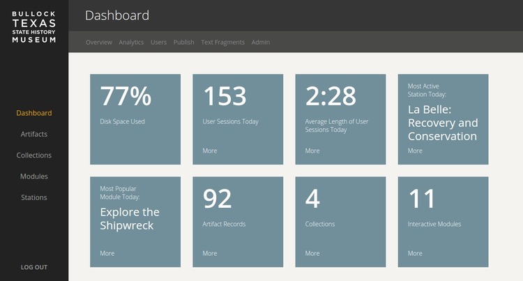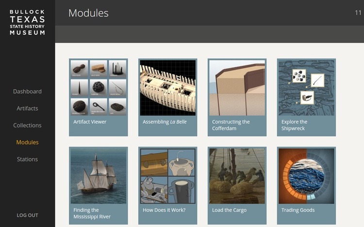 Terra Incognita was responsible for designing kiosk interactives and a companion CMS for the Bullock Texas State History Museum’s La Belle Shipwreck exhibit. Thamtech consulted on the overall software architecture, implemented the CMS, and lead the team of interactive kiosk developers.