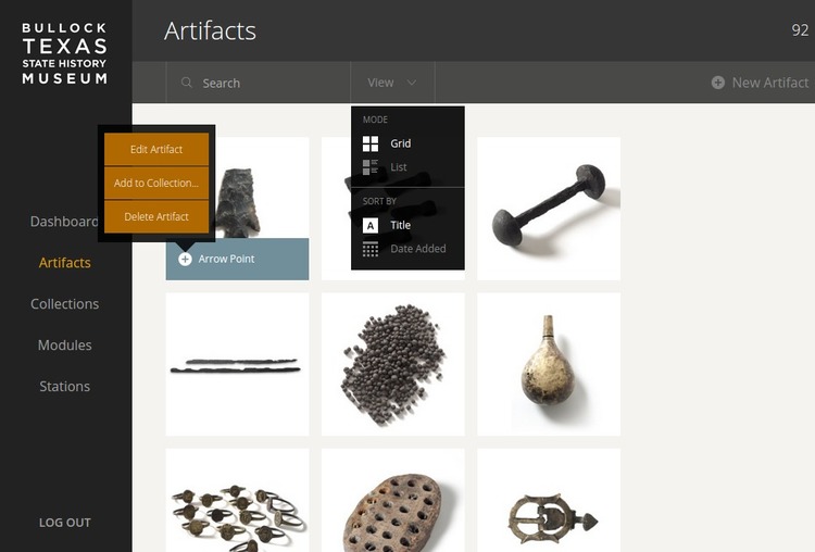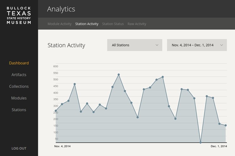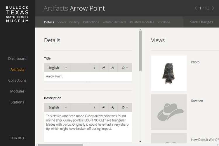 The custom-designed CMS manages Artifacts, 360-rotation image sets, videos, kiosk stations, and a large collection of interactive modules, each with their own set of content fields. The CMS is implemented as a PHP-based web application within the Yii framework. The CMS core provides basic functionality layered on top of the Yii framework and glues together a number of major subsystems, including: