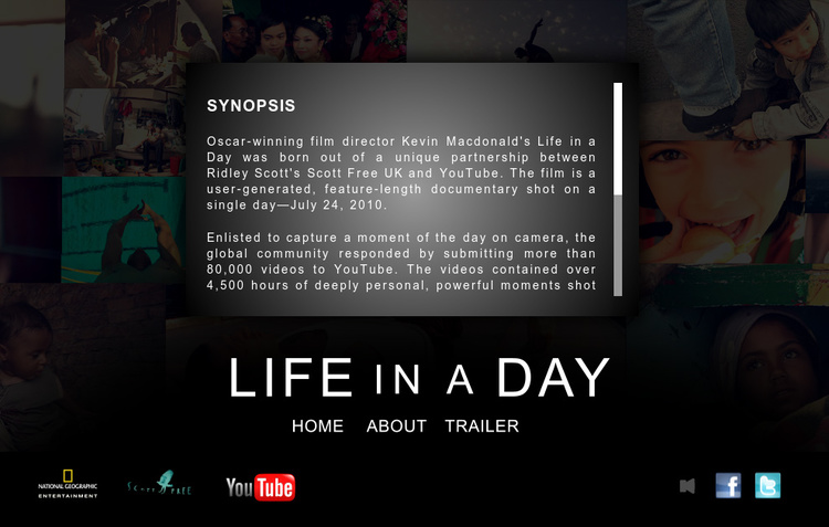 This is an online interactive developed to promote National Geographic’s Life in a Day documentary. The interactive features a sliding collage of images. Each image has a rollover effect and clicks up to a larger image and caption. The About screen uses a non-standard scrollbar design, and the Trailer screen uses YouTube’s HTML5 embedded player to maximimize support for mobile platforms like the iPad.