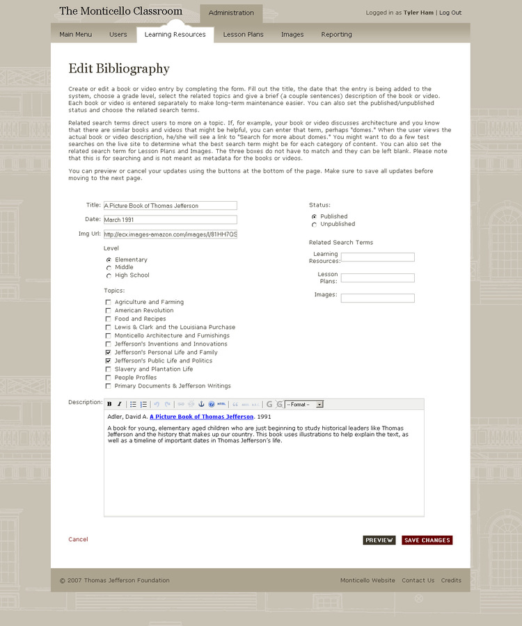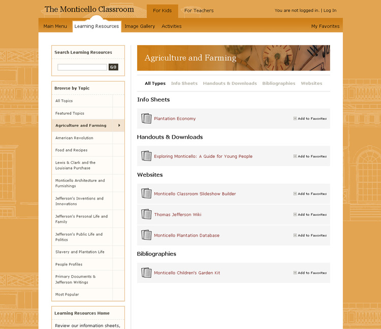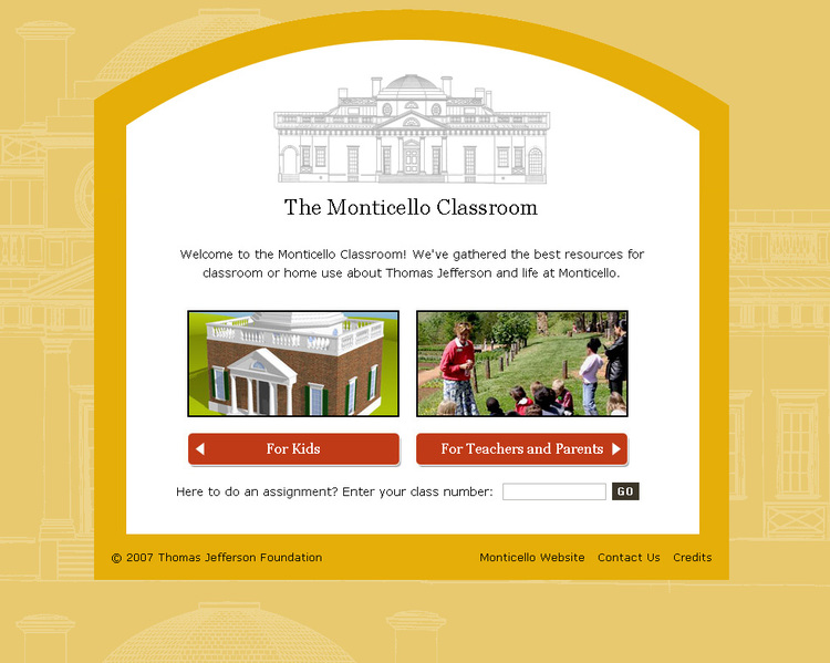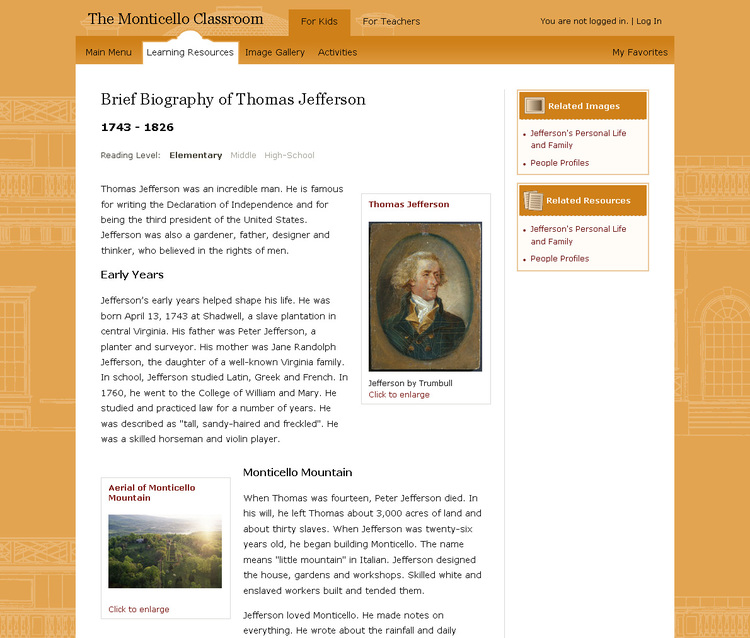 **Description: **The Monticello Classroom contains a collection of content related to Thomas Jefferson and his Monticello estate. The website is geared towards elementary and middle school classrooms. Teachers can sign in, build assignments and assign them to their students. The students can then sign in and complete the activities.