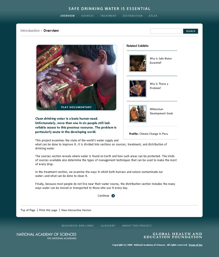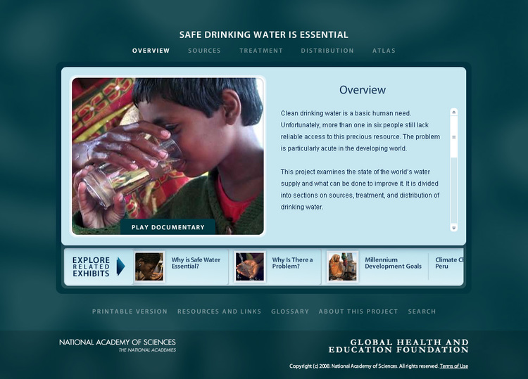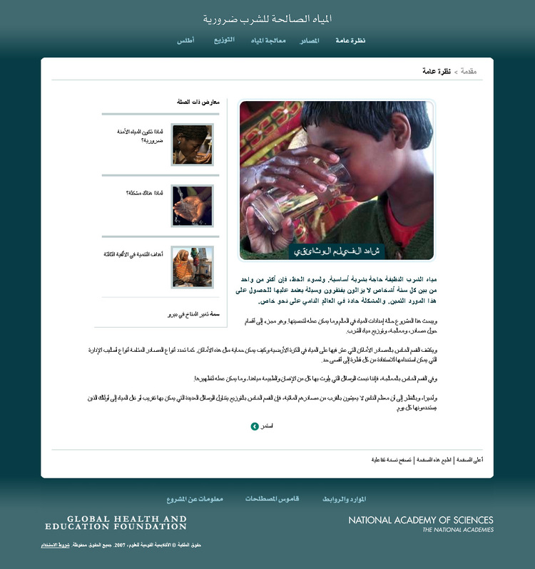 **Description: **There are many components to this project. The interactive is built in Flash. The printable and accessible alternative is built in HTML. Both of these versions exist on the webiste. Both versions were also adapted for distribution on compact disc. In addition to English, the Flash versions are also implemented in Chinese, French, and Spanish. The HTML versions are implemented in all five target languages: Arabic, Chinese, English, French, and Spanish.
